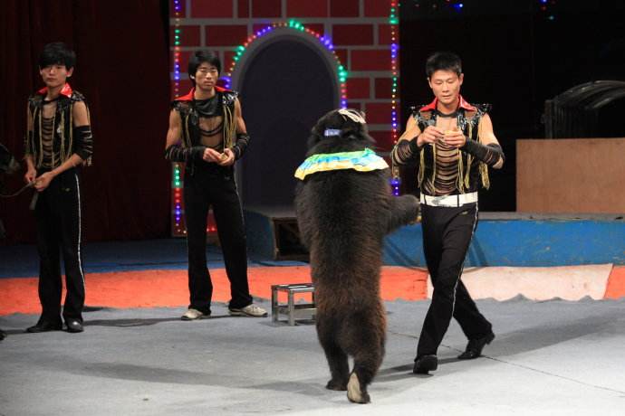 北京馬戲表演:人們觀看馬戲時,對那些小狗算算術(shù)、狗熊打籃球、猴騎車、馬跳舞、山羊走鋼絲、駱駝轉(zhuǎn)圓圈,以及獅子、老虎走木樁、審火圈等表演,無不驚奇贊嘆。