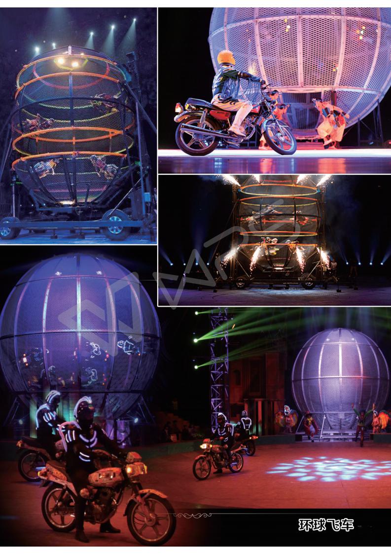 簡介—— 河南馬戲表演:環球飛車是一種將在直徑只有6.5米乃至僅有4.5米的圓形鐵球內,1至8輛摩托車以每小時80公里的速度完成交